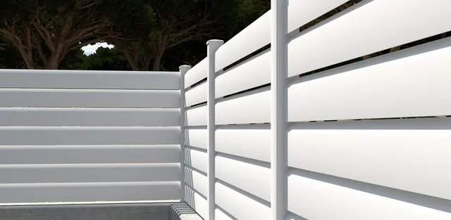 Ocultación y ventilación combinadas con la máxima elegancia. Lamas biseladas para impedir la visión pero dejando pasar el aire.